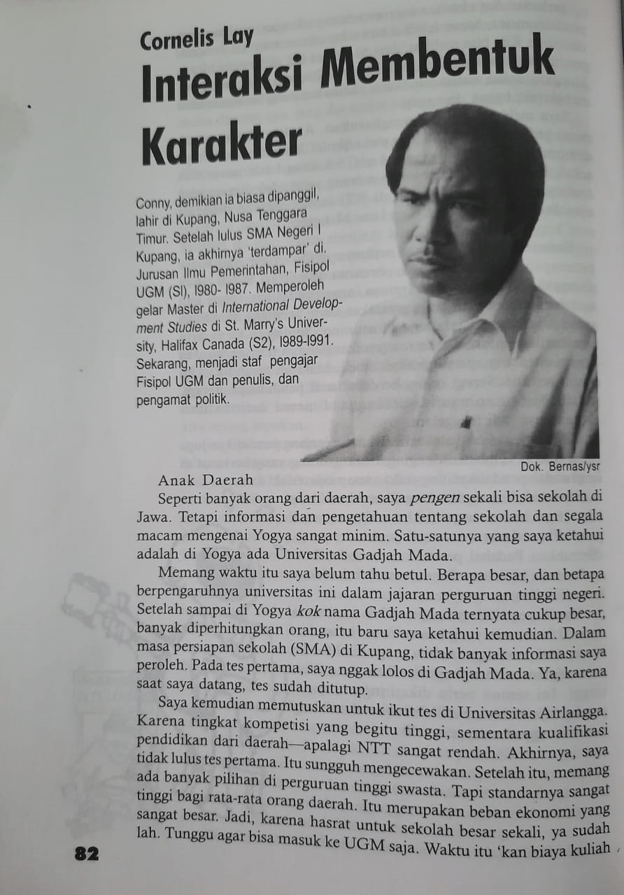 Tulisan tentang Cornelis Lay ini sengaja tidak diubah dari bentuk aslinya 22 tahun silam. Tahun 1998. Waktu itu ia diwawancarai sebagai salah seorang role model kami, para mahasiswa di Jogja. Jadi kumpulan narasi mereka sengaja menjadi bahan belajar kami. Sengaja mereka yang terpilih berasal intelektual, aktivis, seniman, penulis, pendidik, dan filsuf untuk diabadikan dalam buku yang bertajuk Belajar Untuk Hidup. Bukan sekedar belajar untuk dapat gelar. Buku ini diterbitkan secara eksklusif untuk para mahasiswa baru tahun 1998 sebagai ‘Buku Suci Ospek’. Buku ini sendiri juga menjadi salah satu artefak sejarah, beberapa orang yang ditulis sudah meninggal, dan ada penulisnya pun yang sudah meninggal.